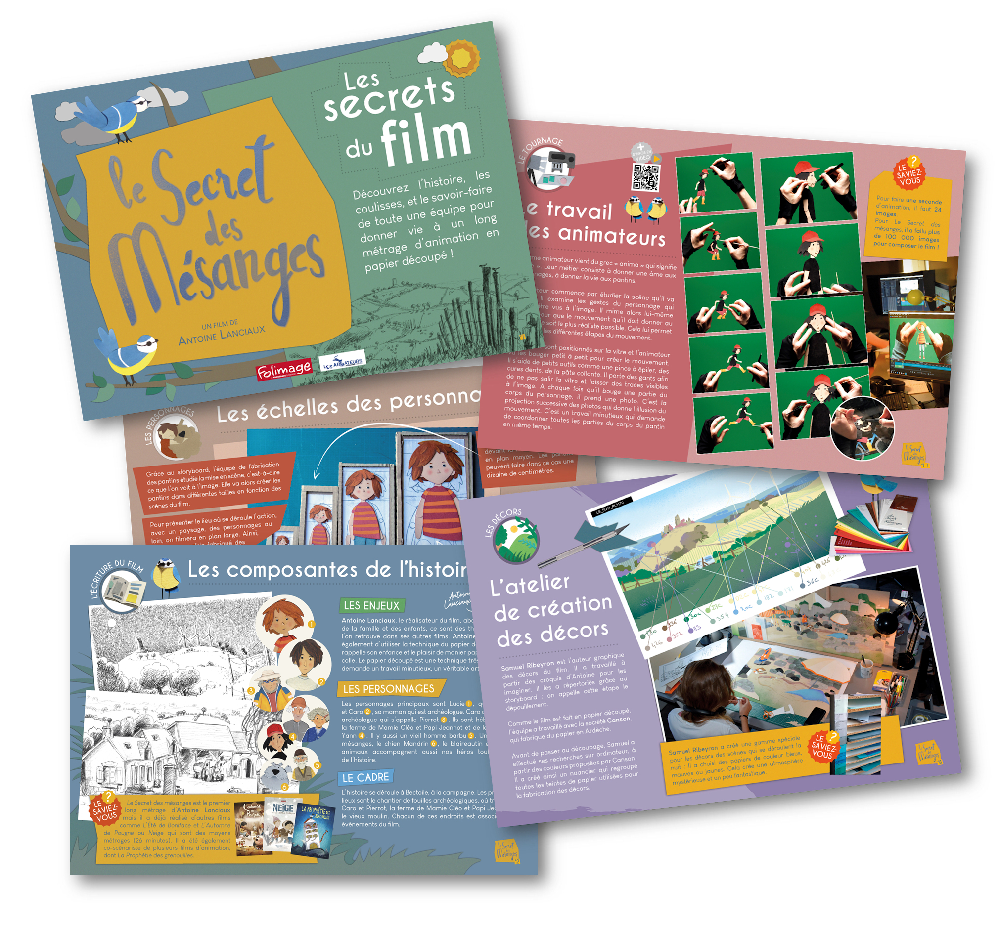 L’exposition « Le Secret des Mésanges – Les secrets du film » est conçue en 15 panneaux au format A3 pour comprendre les composantes de l'histoire et ses influences, les enjeux de la technique, et les principales étapes de la fabrication de ce projet porté par le studio Folimage : le scénario, les décors, les personnages, l'influence drômoise, le lien avec l'archéologie, les composantes du son et de l'image... et l'animation bien sûr ! Parmi les 15 panneaux, 7 intègrent des flashcodes menant vers de courtes vidéos making-of.